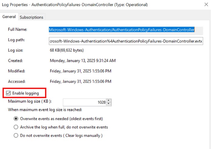- In “Microsoft-Windows-Authentication/AuthenticationPolicyFailures-DomainController”