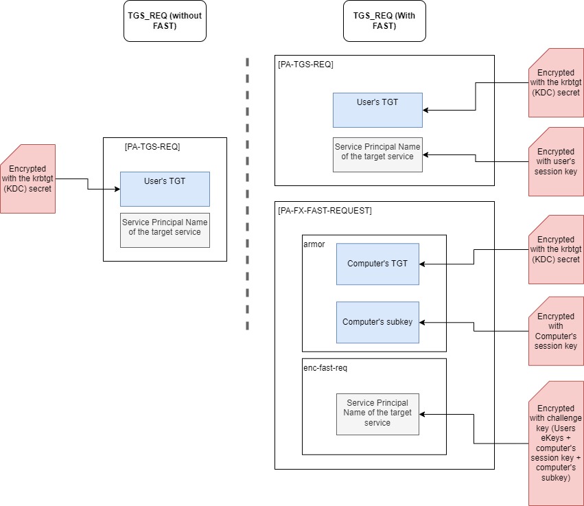 Kerberos initial pre-authentication steps are vulnerable to password cracking. Computer AD account password are complex enough to mitigate this type of attacks. User AD account password are less complex. Since users authenticate on domain computers that have already authenticated to the domain, the idea of FAST is to strenghten user’s pre-authentication steps with this already existing and available computer’s secret (the computer’s session key).