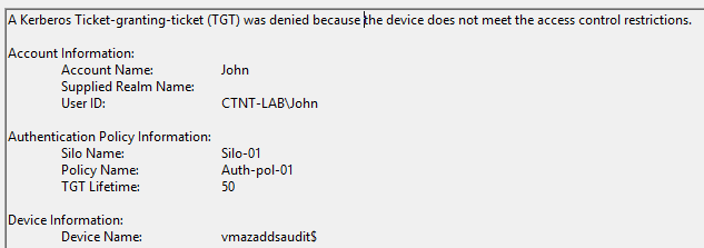 A Kerberos restriction failure occurs because the authentication from a particular device was not permitted. An event is logged in the domain controller to indicate that a Kerberos TGT was denied because the device did not meet the enforced access control restrictions. Displays the account, device, policy, silo names, and TGT lifetime. |