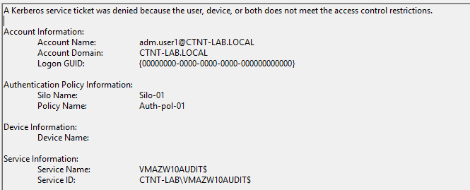 A Kerberos restriction failure might occur because the user or device was not allowed to authenticate to the server. In audit mode, an informational event is logged on the domain controller to indicate that a Kerberos service ticket will be denied because the user, device, or both do not meet the access control restrictions. Displays the device, policy, and silo names. |