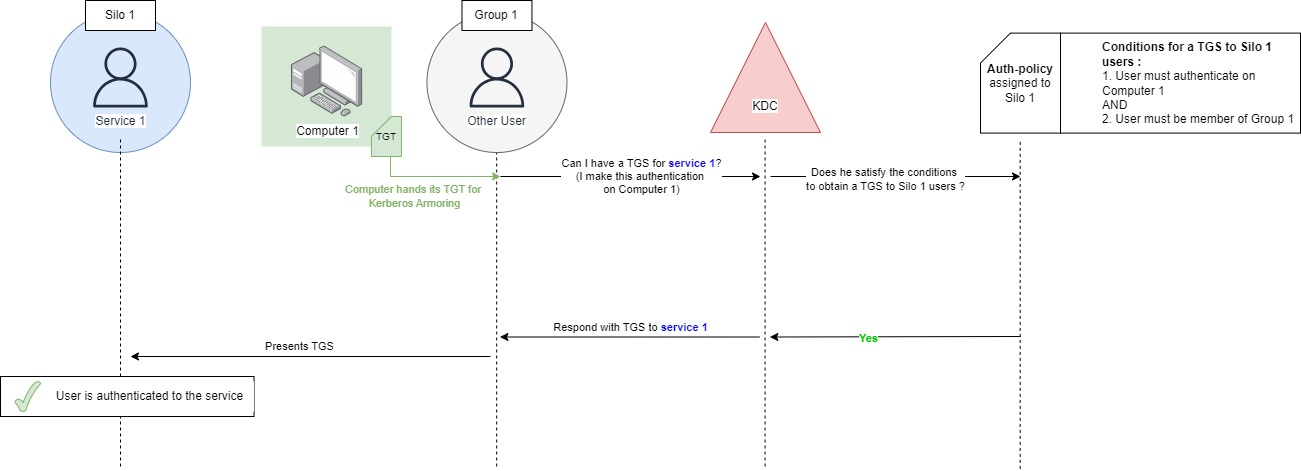 Another example, a service is running under an user account context. An authentication policy assigned to this user account might impose conditions on which other user can access this service (i.e request a TGS for it). The authentication policy might require those other account to be member of a specific group or silo - see [[#Scenario 2 - TGS request restriction to Windows session |Scenario 2]] and [[#Scenario 3 - TGS request restriction to services running under user accounts (not tested)| Scenario 3]]. On Scenario 2, the service is the windows login session and it is running under the computer account running context but the operation remains the same (the user still require a TGS to access its windows session and an authentication policy can restrict this request).