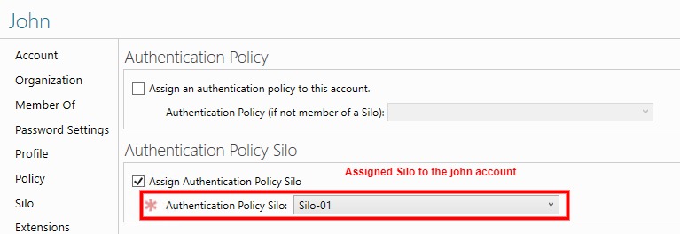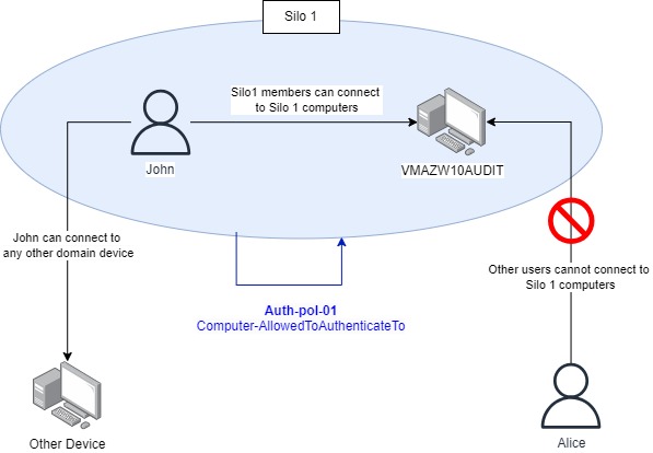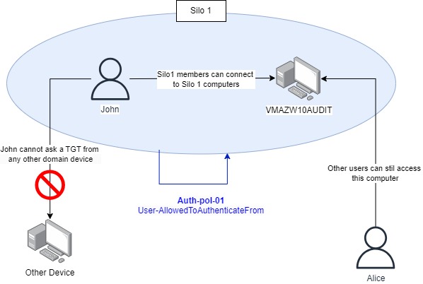 - Computer accounts that are members of Silo 1 have ComputerAllowedToAuthenticateTo set to “Users accounts members of Silo-01”