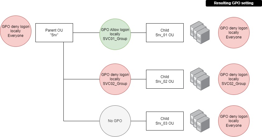 - Deny logon GPOs cannot push “deny all but exception group” type policies. They can only point specific user groups that are not allowed.