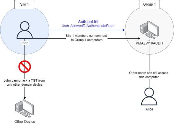 For example, an authentication policy assigned to a user account might impose conditions on which he can obtain a TGT. This authentication policy might require that the user make its TGT request from a computer that is member of a specific group or Silo (see [[#Scenario 1 - TGT request restriction | Scenario 1]] further down). If the user makes a connection from another device, the TGT request is refused.